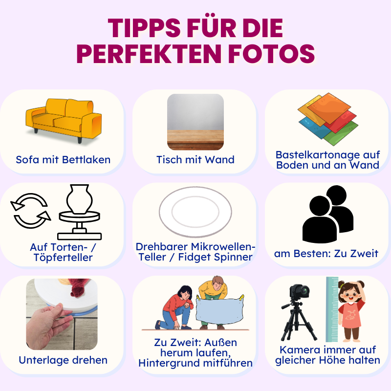 - eine drehbare Unterlage wie ein Tortenteller, Mikrowellenteller, Fidget Spinner, Töpferteller oder leichtläufige Kartonunterlage erlaubt berührungsfreies Drehen!