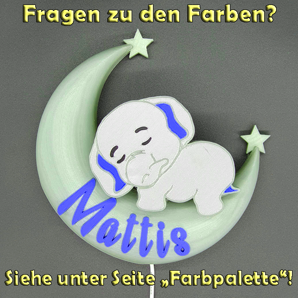 Die 3D-Mondlampe mit Elefant ist ein bezauberndes und personalisierbares Dekorationsstück, das perfekt für jedes Kinderzimmer oder als besonderes Geschenk geeignet ist. Mithilfe des omauso Produkt Generators kannst du deinen individuellen Namen und frei wählbare Farben hinzufügen, um ein einzigartiges Erlebnis zu schaffen.
