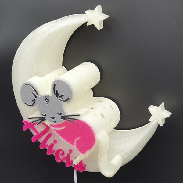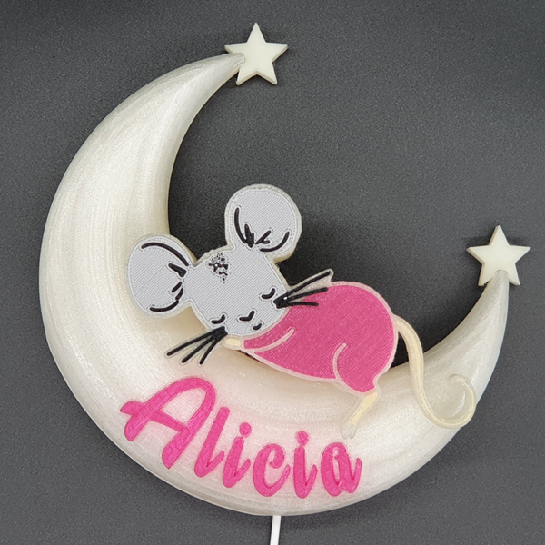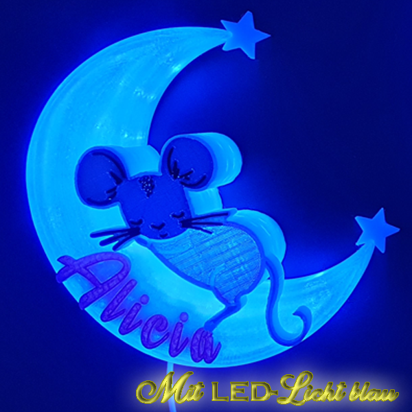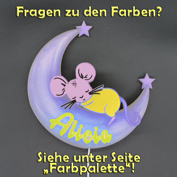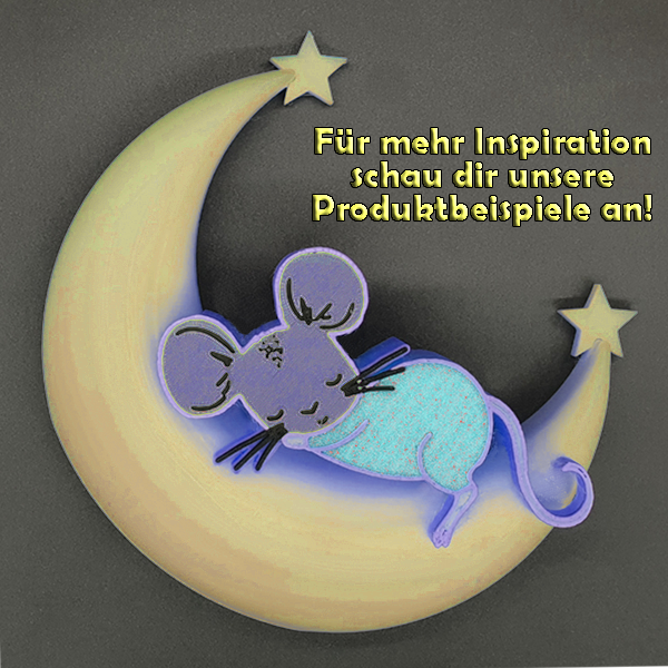 Die 3D-Mondlampe mit Maus ist ein bezauberndes und personalisierbares Dekorationsstück, das perfekt für jedes Kinderzimmer oder als besonderes Geschenk geeignet ist. Mithilfe des omauso Produkt Generators kannst du deinen individuellen Namen und frei wählbare Farben hinzufügen, um ein einzigartiges Erlebnis zu schaffen.