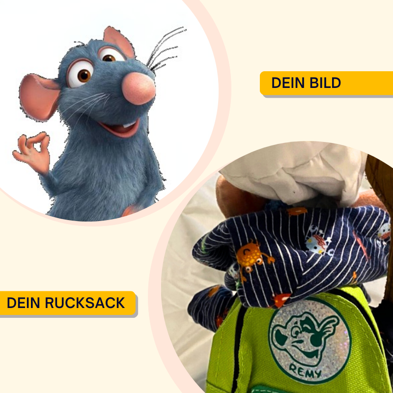 Dein persönlicher Rucksack in blau, gelb, grün oder rosa in Plüschie Größe - lade einfach dein Wunschbild in den omauso Produkt Generator, wir arbeiten es grafisch perfekt für dein neues Reisegepäck aus!