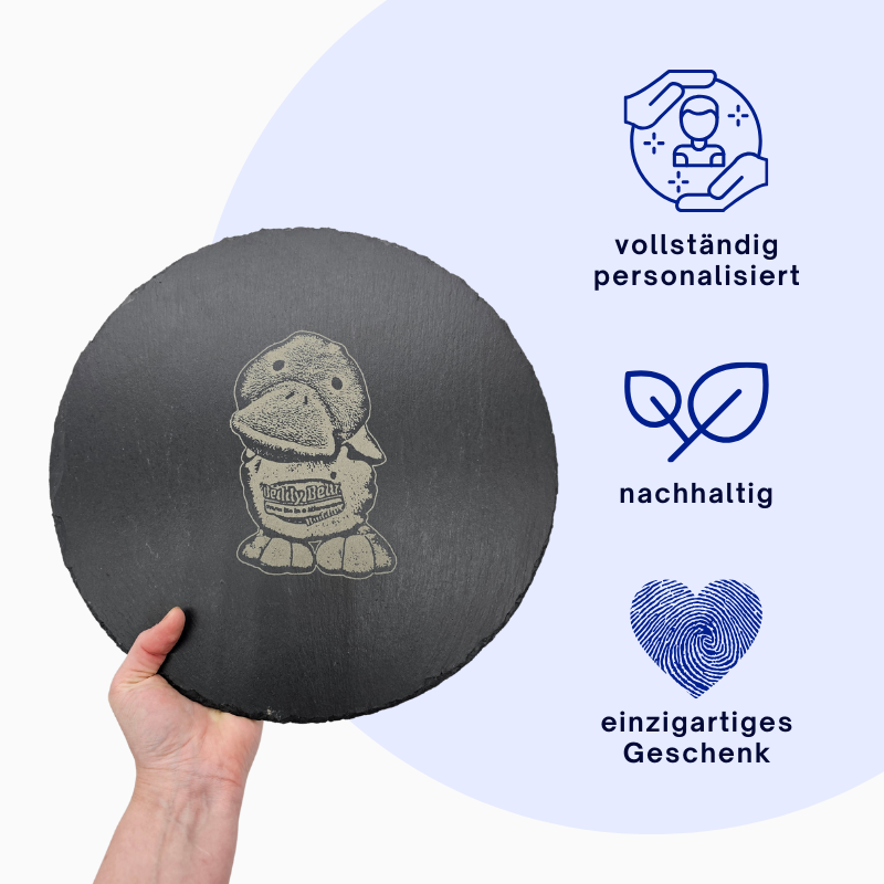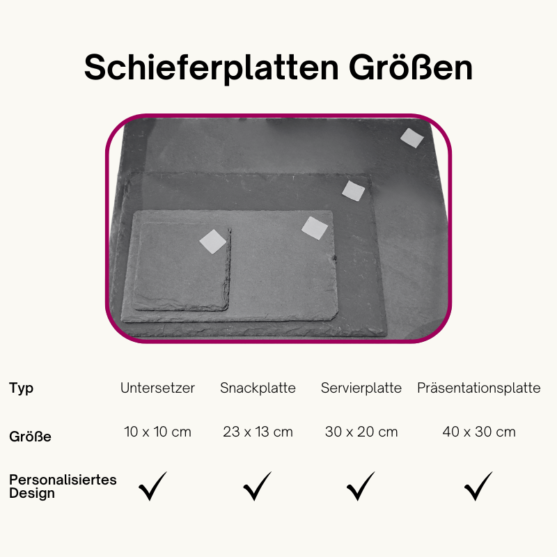 Setze einen besonderen Akzent in deinem Alltag: Schiefer-Stein ist ein wunderschöner Hingucker und mit deiner individuellen Gravur der absolute Hingucker. Ob als Geschenk oder für den eigenen Gebrauch: Dein einzigartiges Foto, eine persönliche Widmung, ein Name, ein besonderes Datum oder ein individuelles Logo wie Familienwappen oder Firmenlogo machen die Natursteinplatte zu etwas ganz Besonderem.