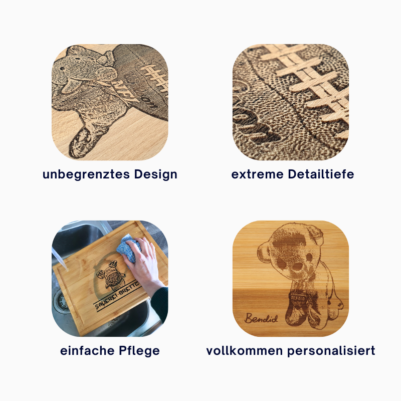 Mache dein Frühstücks- oder Schneidebrett zu einem einzigartigen Highlight mit einer individuellen Gravur. Ob als Geschenk oder für den eigenen Gebrauch: Dein einzigartiges Foto, eine persönliche Widmung, ein Name, ein besonderes Datum oder ein individuelles Logo wie Familienwappen oder Firmenlogo machen jedes Brett zu etwas ganz Besonderem.